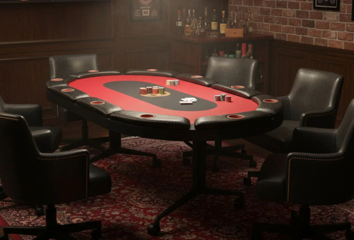 Each Triton table features a heavy-duty steel frame, padded faux-leather armrests, stainless-steel cup holders, and a premium felt surface for smooth card glide and consistent play.